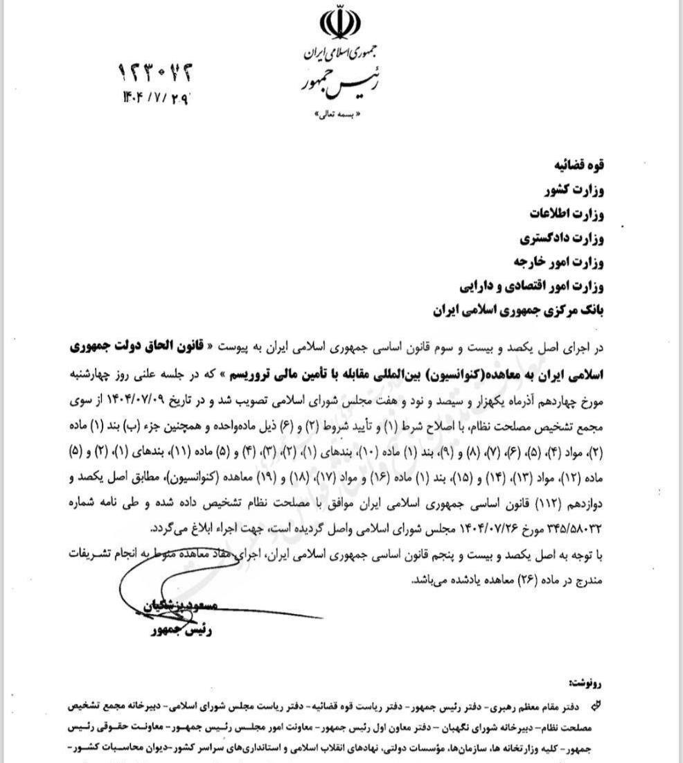 سه شنبه - ۱۴۰۴/۰۷/۲۹ - ۲۲:۴۰دسته بندی سیاسی پزشکیان، قانون پالرمو و سیافتی را ابلاغ کرد 🔹رئیس جمهوری، قانون الحاق دولت ایران به کنوانسیونهای پالرمو و سیافتی را به وزارتخانههای مرتبط ابلاغ کرد. @navasanchannel