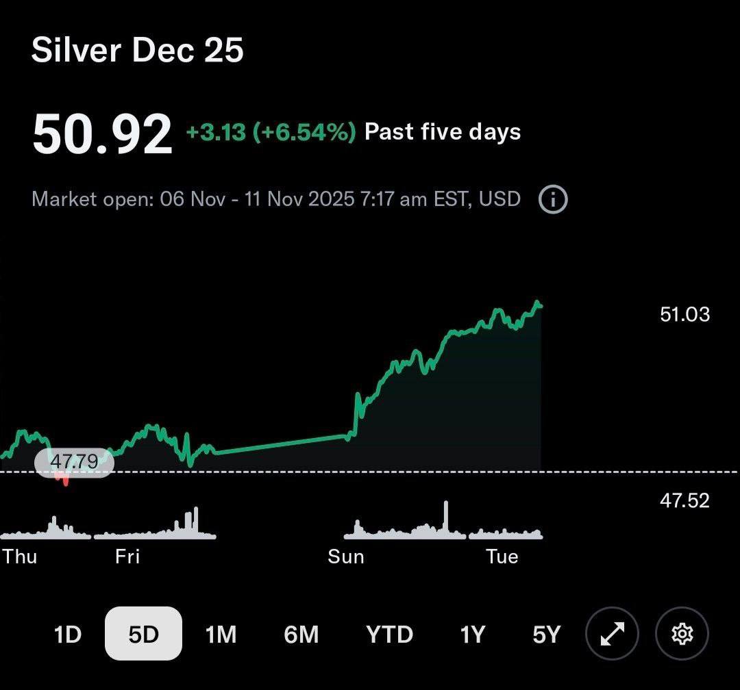سه شنبه - ۱۴۰۴/۰۸/۲۰ - ۱۷:۵۰دسته بندی اقتصادی بازگشت قدرتمند نقره!! 🔹بازدهی هفتگی نقره یه بیش از ۶.۵٪ رسیده است و در یک قدمی ۵۱ دلار به ازای هر اونس رسیده است @navasanchannel
