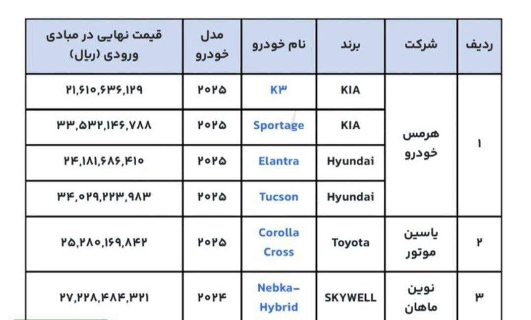 🔹در سومین دوره عرضه خودروهای وارداتی در سال جاری، ۶ مدل خودرو عرضه شده که قیمت این خودروها از ۲ میلیارد و ۱۰۰ میلیون تومان تا چهار میلیارد و ۸۰۰ میلیون تومان است.