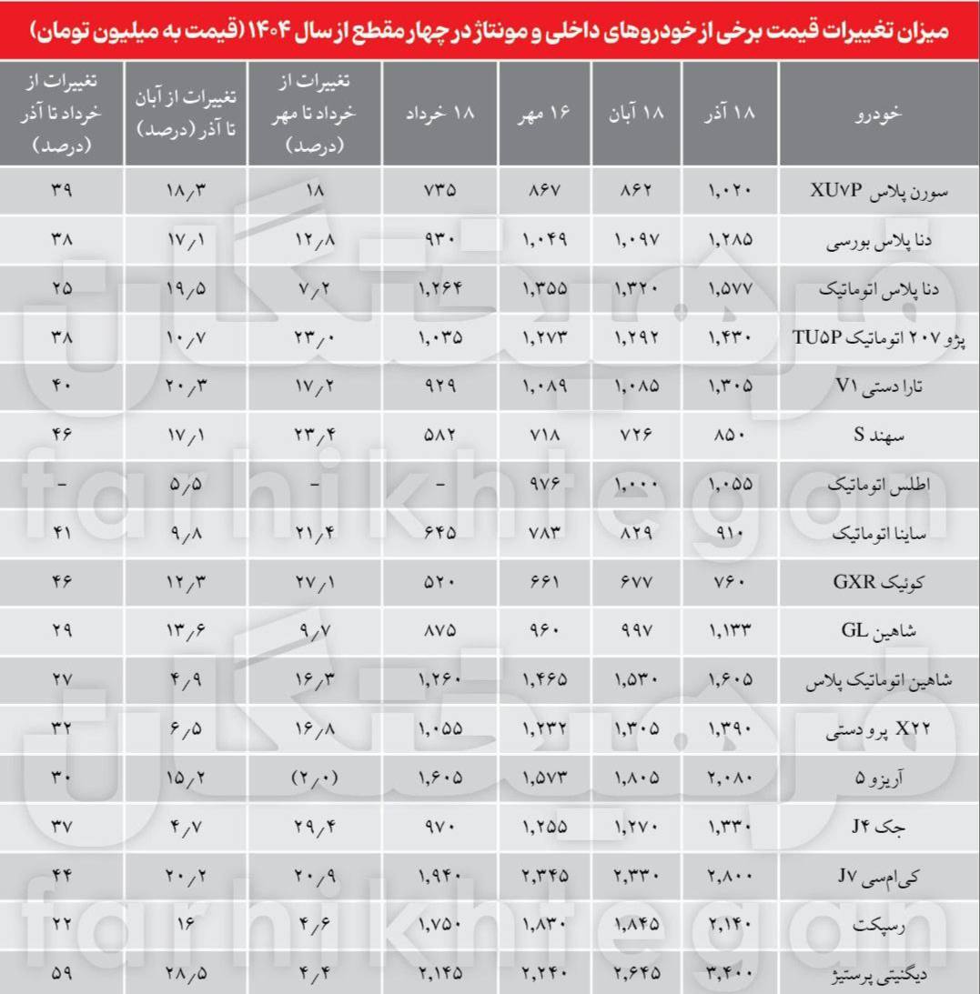 🔹از طرفی از ۱۸ خرداد تا امروز، قیمت خودروها حدود ۴۰ درصد جهش داشته و بسیاری از مدلها؛ از ۲۰۶ تیپ ۲ گرفته تا دنا پلاس و تارا، بین ۲۲ تا ۵۹ درصد گرانتر شدهاند.