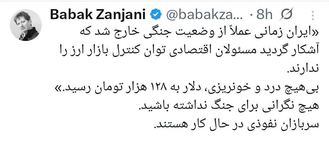 شنبه - ۱۴۰۴/۰۹/۲۲ - ۲۱:۱۴دسته بندی اقتصادی بابک زنجانی: هیچ نگرانی برای جنگ نداشته باشید. سربازان نفوذی در حال کار هستند @navasanchannel