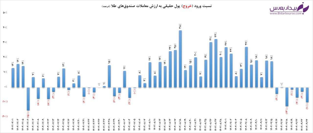 🔹همچنین امروز شاهد خروج حدود 1937 میلیارد تومان نقدینگی حقیقی‌ها از صندوق‌های طلا بودیم. نسبت ورود پول افراد حقیقی به ارزش معاملات در صندوق‌های طلا به منفی 10 درصد رسید.