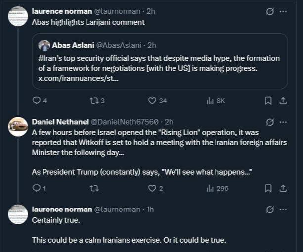 🔹یک کاربر توئیتر به لارنس نورمن متذکر می شود که حمله اسرائیل به ایران درست زمانی رخ داد که ترامپ از مذاکره با ایران حرف می زد؛