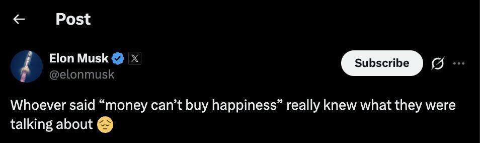 پنجشنبه - ۱۴۰۴/۱۱/۱۶ - ۱۰:۱۹دسته بندی اقتصادی توییت عجیب ایلان ماسک: کسی که گفت «پول نمیتواند خوشبختی بیاورد» واقعاً میدانست درباره چه چیزی صحبت میکند @navasanchannel