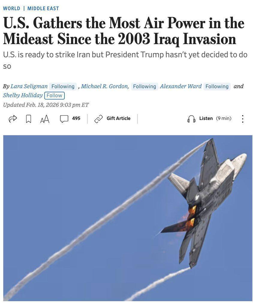 وال استریت ژورنال: ایالات متحده بزرگ‌ترین تجمع هوایی خود در خاورمیانه از سال ۲۰۰۳ را در حال انجام است و برای حملات احتمالی به ایران موقعیت‌گیری می‌کند. اما ترامپ هنوز تصمیم نگرفته است.